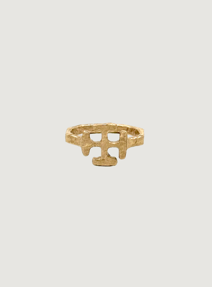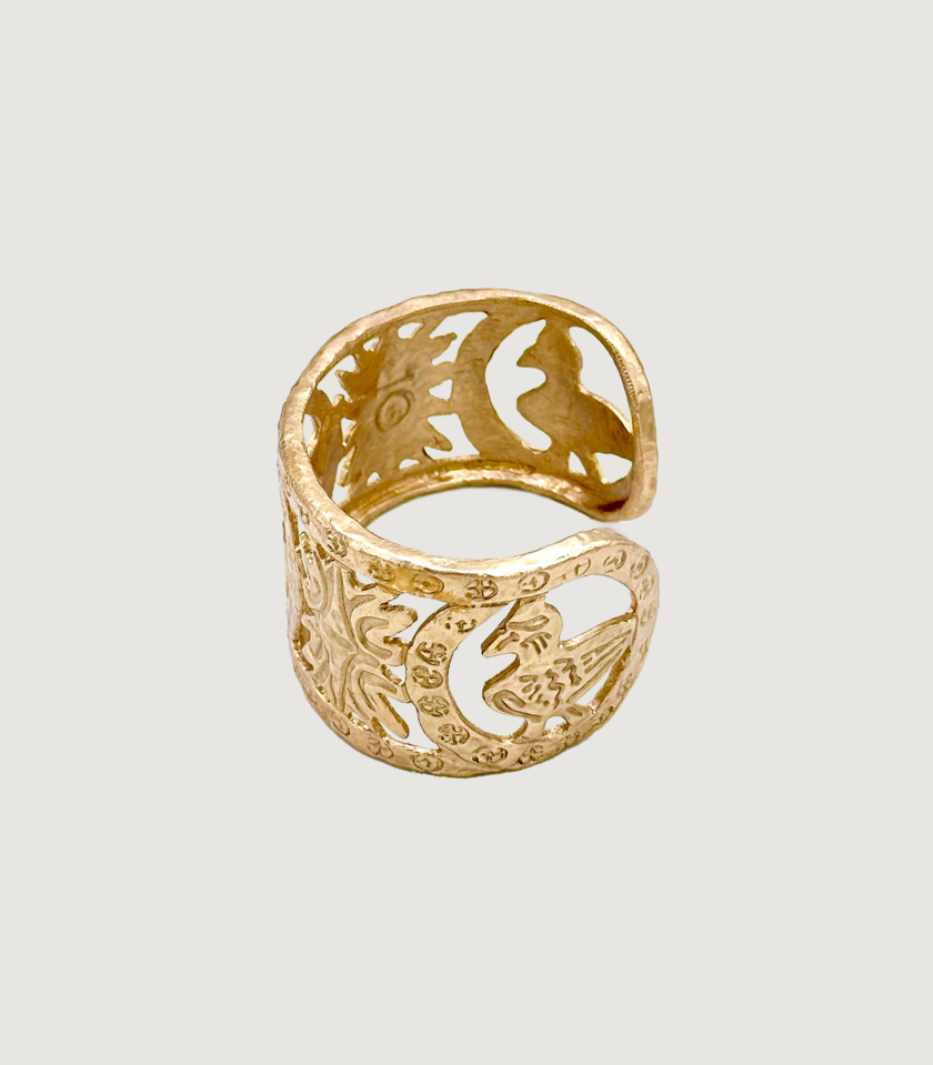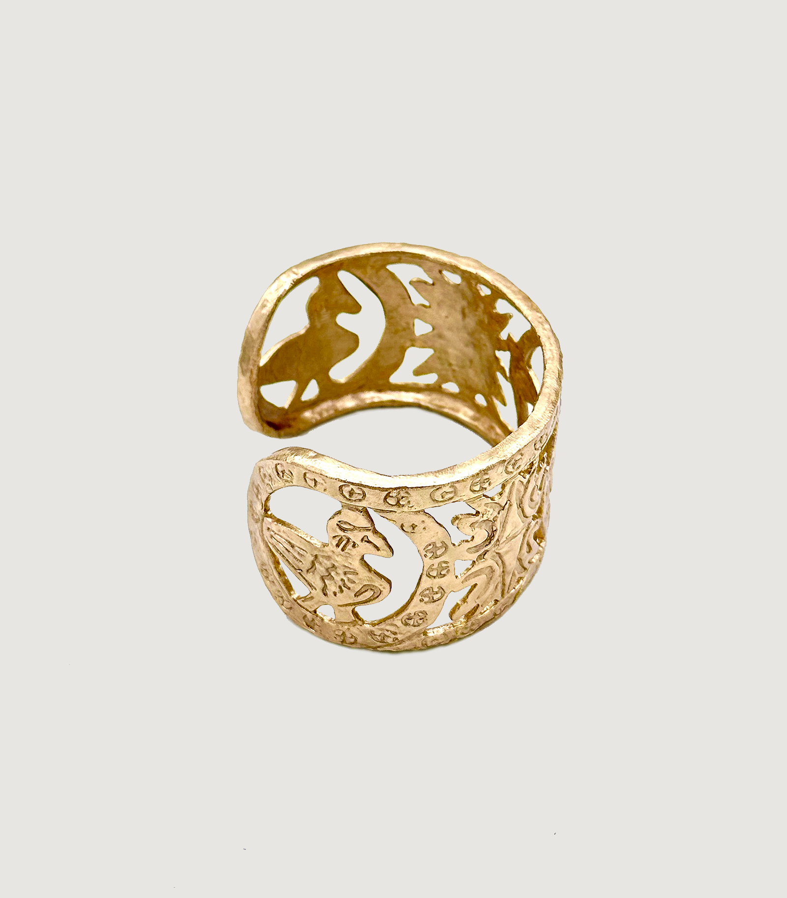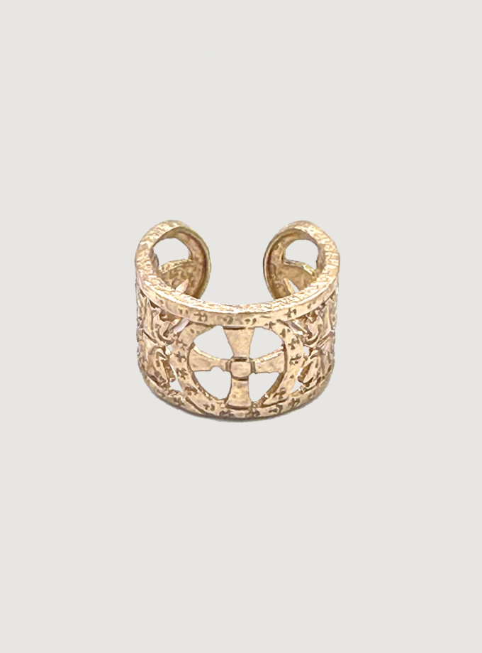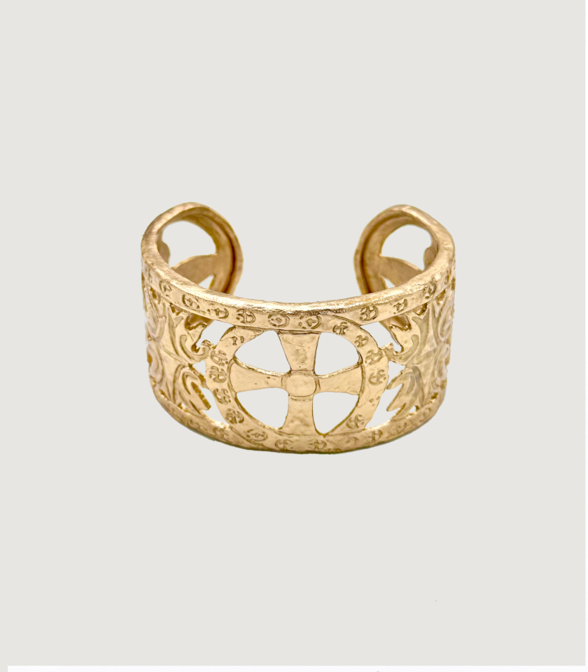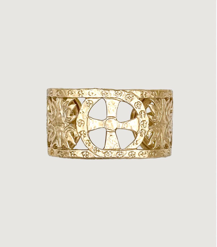 Bronze adjustable bangle with pierced cross, bird and acanthus leaf motif, typical of the Byzantine or Eastern Roman Empire, 5th-15th century AD. Original gold ring from a private collection.